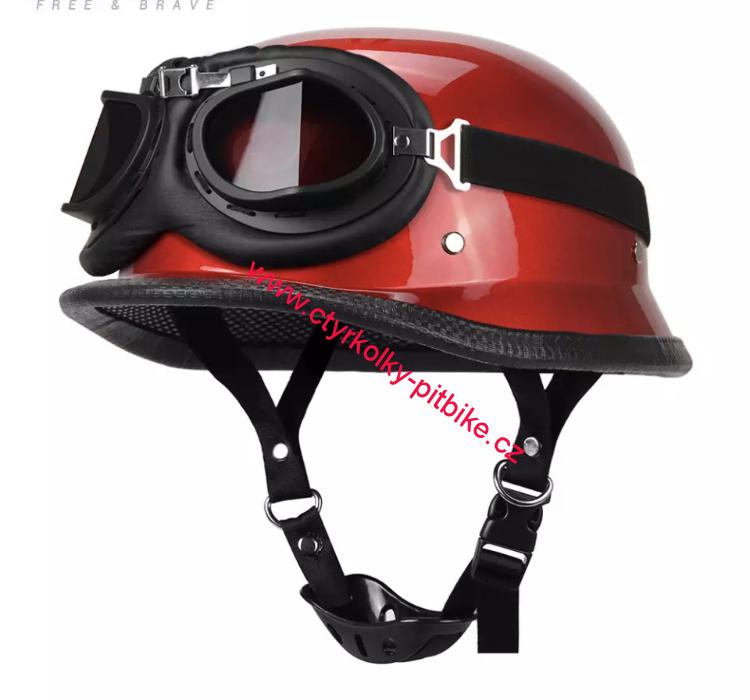 Německá retro moto helma s brýlema červená