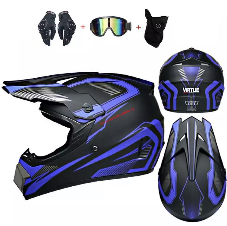 Moto crossová helma EXTREME RIDE modrá s brýlemi rukavicemi a nákrčníkem