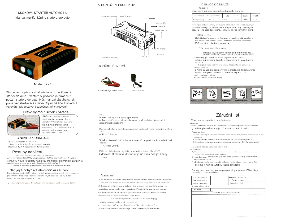 Příslušenství: kabelové svorky - pro autobaterie, kabel pro nabíjení a napájení až 3 různých zařízení